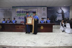 Bernardo Fernández García, prestigioso físico y docente universitario y ganador del Premio Universidad 2019 recibió de manos del rector de la Universidad de Panamá, Eduardo Flores Castro, una medalla de oro de 18 quilates, un pergamino y un premio en metálico de cinco mil balboas, todo ello en acto realizado en el Paraninfo Universitario.