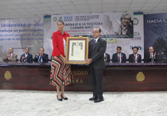 La doctora Carmen Miró, una de las académicas e investigadoras de mayor prestigio en el país, recibió el doctorado honoris causa otorgado por la Universidad Panamá; esta actividad contó con la participación de las autoridades universitarias, encabezados por el rector Eduardo Flores Castro.