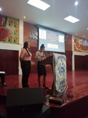 Las estudiantes de la facultad de PsicologÃa, Yini DomÃnguez Villareal y Rosibel Jaén, disertaron sobre el Papel del Psicológico en la prevención del suicidio, asesoradas por el magÃster Héctor Camarena y la coordinadora de la facultad, magÃster Cintia Corro.