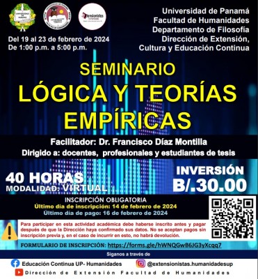 La Dirección de Extensión, Cultura y Educación Continua de la Facultad de Humanidades de la Universidad de Panamá invita a los interesados en profundizar sus conocimientos en lógica y teorÃas empÃricas a participar en el Seminario intensivo programado del 19 al 23 de febrero de 2024.