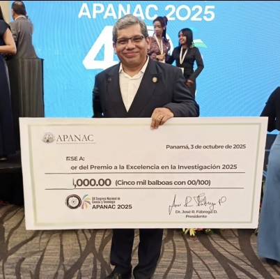 El doctor Enrique Medianero Segundo, catedrático en biologÃa ambiental de la Facultad de Ciencias Naturales, Exactas y TecnologÃa de la Universidad de Panamá, fue galardonado con el premio a la “Excelencia en la Investigación 2025" en el XX Congreso Nacional de Ciencia y TecnologÃa, con el lema “Cuatro décadas de impacto global y excelencia cientÃfica en Panamá".
