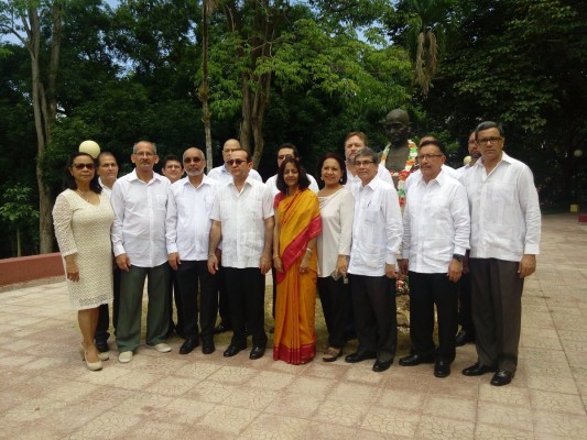 La embajadora Shamma Jain, junto al rector y demás autoridades universitarias, participaron en la colocación de una ofrenda floral en el busto de Mahatma Gandhi, que se encuentra ubicado en la Colina de la Casa de Méndez Pereira.