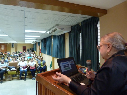 La doctora Amelia Pérez, dicto la conferencia el Rol del Trabajador Social Frente a los Objetivos del Desarrollo Sostenible. Acto que tuvo lugar en la Universidad del Trabajo y la Tercera Edad de Azuero, el 6 de septiembre de 2018.
