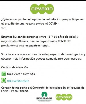 El instituto de Investigaciones Científicas y Servicios de Alta Tecnología AIP (INDICASAT) de la Secretaria Nacional de Ciencia, Tecnología e Innovación (SENACYT), hace un llamado a todo aquel que desee ser voluntario para el estudio d la vacuna COVID-19.