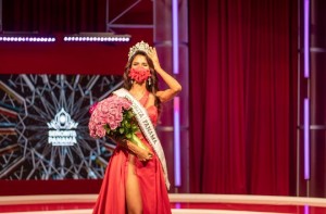 Luciendo un elegante vestido rojo y mostrando una mascarilla también de color roja que resaltaba la elegancia de Carmen Jaramillo, quien se coronó como la nueva señorita Panamá para Miss Universo 2020.