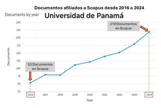 La Universidad de Panamá ha logrado un crecimiento significativo en la producción científica, como lo demuestra el aumento sostenido de documentos afiliados a la prestigiosa base de datos Scopus. Según datos recientes, la cantidad de publicaciones ha pasado de 53 en 2016 a 219 en 2024, lo que representa un incremento de más del 300%.