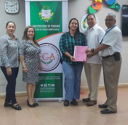 El profesor Enrique Wedemeyer, quien dicta el curso de Extensión Rural en la Facultad de Ciencias Agropecuarias (FCA) de la Universidad de Panamá, sede Chiriquí hace entrega de documento investigativo a la Biblioteca, junto a Emily Camarena, estudiante de zootecnia y en representación de treinta y cuatro (34) estudiantes.